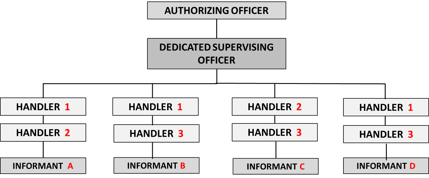 To manage confidential informants safely and cost-effectively they should ONLY be managed by officers trained and dedicated to that role. This means that this dangerous function is carried out by officers that can identify and manage the risks and obtain the maximum benefit form managing the informant. There are three ranks involved. The Authorizing Officer who authorizes on behalf of the Chief of Police that the person is suitable to be an informant. Think Captain or Major. The Dedicated Supervisor is responsible for supervising the officers involved with the informant and supervising the management of the informant. Think Sergent. Each informant will have at least two handlers who attend each meeting. One will always be the same sex as the informant.